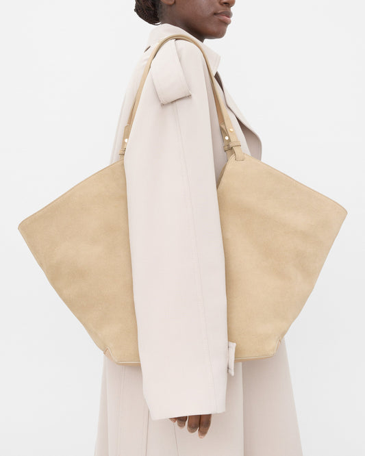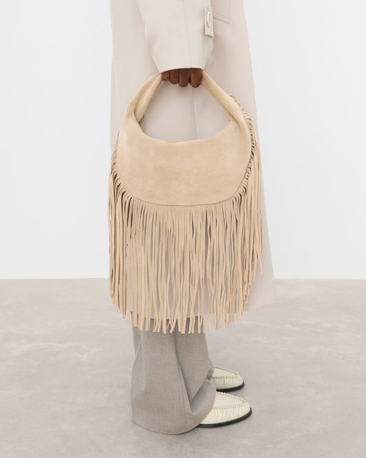 It features a variety of versatile bags, including structured bowling bags that nod to the late 90s with their retro flair. The collection also includes fringed suede styles that are playful and textured, evoking a sense of carefree elegance, alongside generous bucket bags that are practical and spacious enough to carry all essentials.