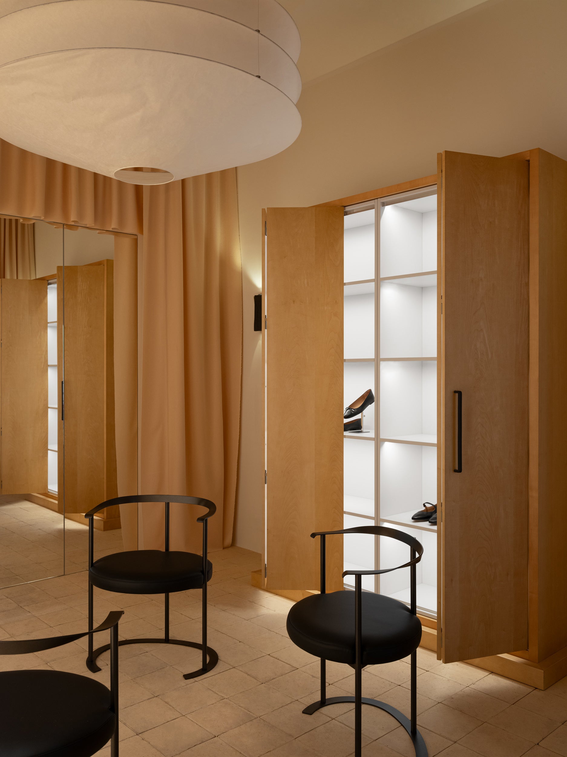 The store’s interior features handmade Italian terracotta floors, black accents, linseed oil- treated metalwork, raw-cut curtains, and warm maple furniture. This combination of materials and textures reflects a distinctly Scandinavian aesthetic, lending the space a warm yet modern atmosphere.